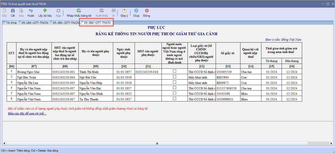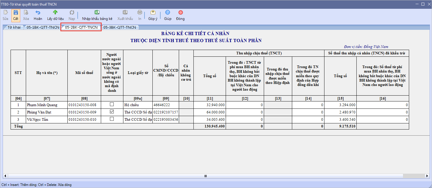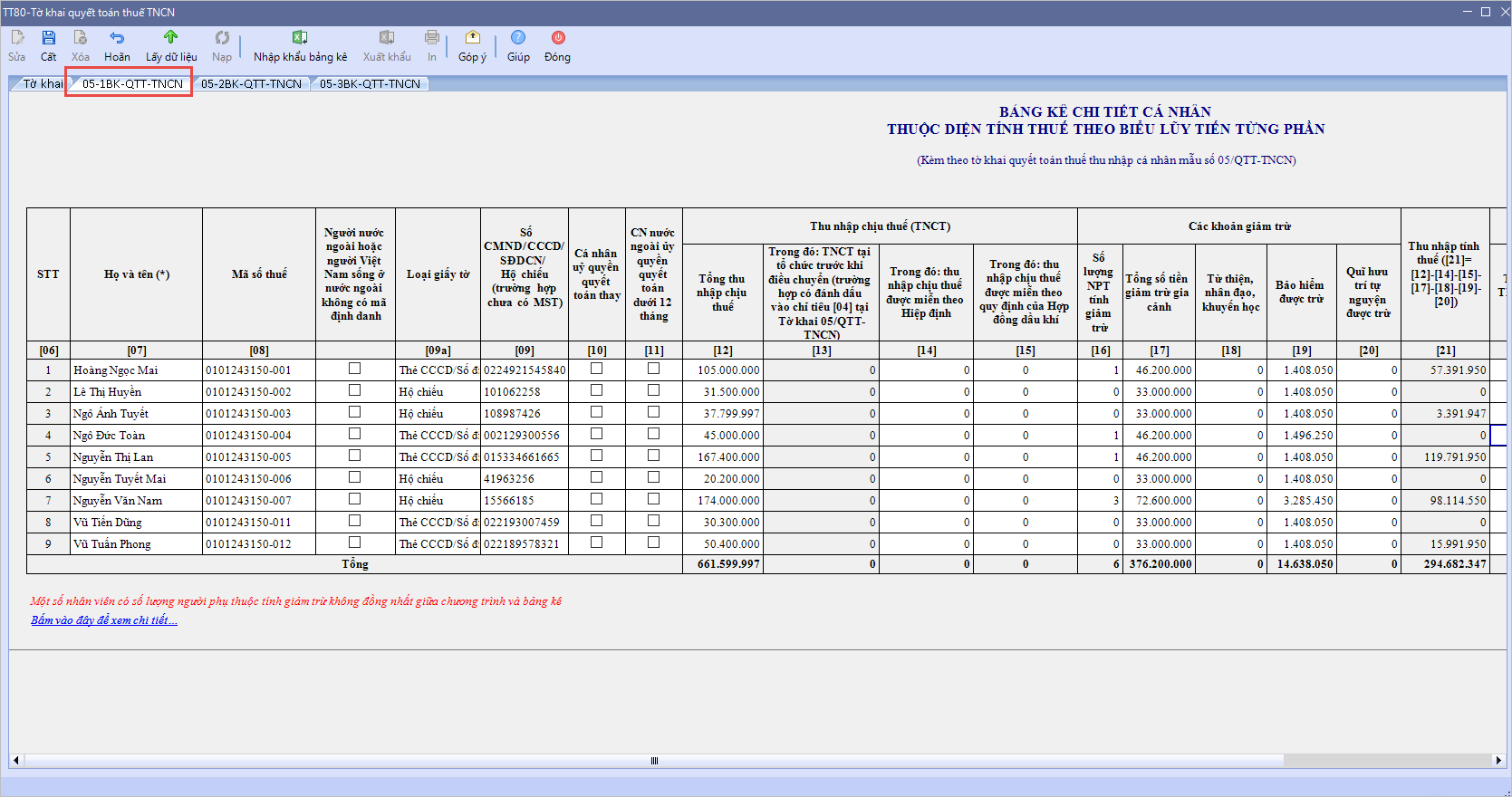 Bước 3. Chương trình tự động tổng hợp số liệu lên tờ khai thuế TNCN, trong đó: