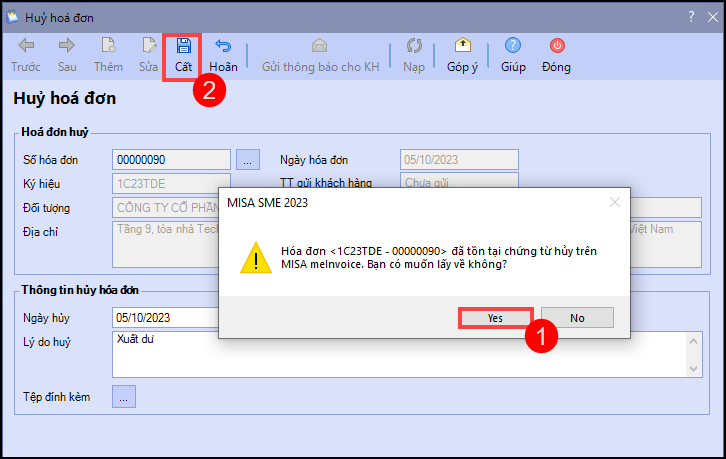 5. Phần mềm sẽ hiển thị bảng cảnh báo Hóa đơn <> đã tồn tại chứng từ hủy trên MISA meInvoice. Bạn có muốn lấy về không? => Nhấn Yes => Nhấn Cất.