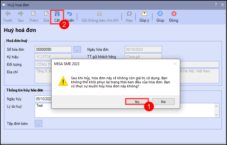 6. Phần mềm sẽ tiếp tục hiển thị cảnh báo Sau khi hủy, hóa đơn này sẽ không còn giá trị sử dụng. Bạn không thể khôi phục lại trạng thái ban đầu của hóa đơn. Bạn có thực sự muốn hủy hóa đơn này không? => Nhấn Yes => Nhấn Cất
