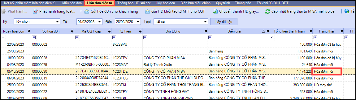 7. Kiểm tra lại trạng thái hóa đơn trên danh sách hóa đơn điện tử.