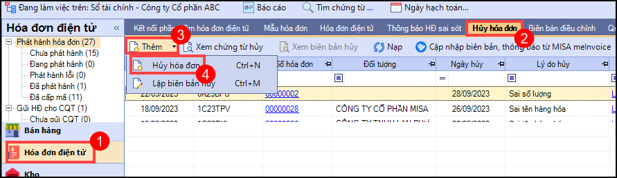 1.Vào phân hệ Hóa đơn điện tử\tab Hủy hóa đơn\chọn Thêm Hủy hóa đơn