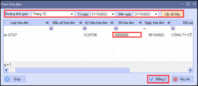 3. Chọn thời gian\ Chọn hóa đơn và nhấn Đồng ý.
