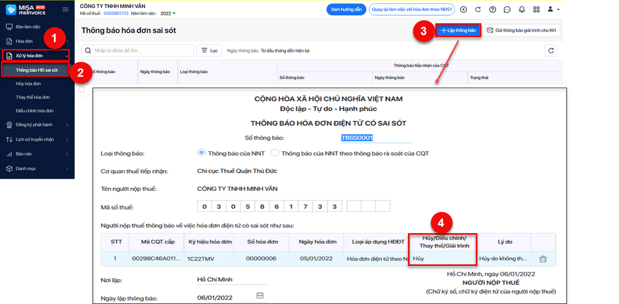 Lưu ý: Sau khi thông báo sai sót gửi đến cơ quan thuế, cơ quan thuế sẽ phản hồi về kết quả tiếp nhận, xử lý thông báo sai sót và gửi thông báo về phần mềm thì bên trang https://hoadondientu.gdt.gov.vn/ mới cập nhật trạng thái hủy.
