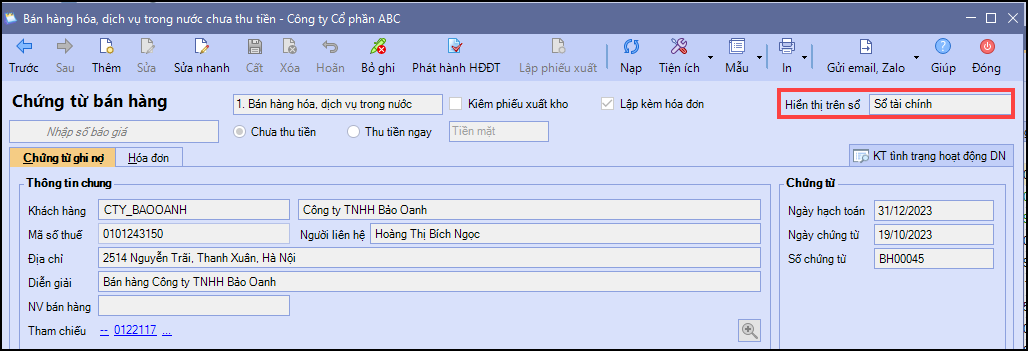 Nếu chứng từ đã lập được hạch toán ở sổ Tài chính (thuế) tích chọn hiển thị trên sổ Tài chính thì sổ Quản trị sẽ không thấy được chứng từ
