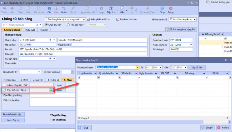 Thực trạng: Khi lập Chứng từ bán hàng (tích lập kèm hóa đơn) hoặc lập Hóa đơn, có tích vào ô Là hóa đơn thay thế, nhưng khi chọn Hóa đơn đã bị hủy để thay thế, thì phần mềm không hiện lên hóa đơn đã bị hủy để chọn.