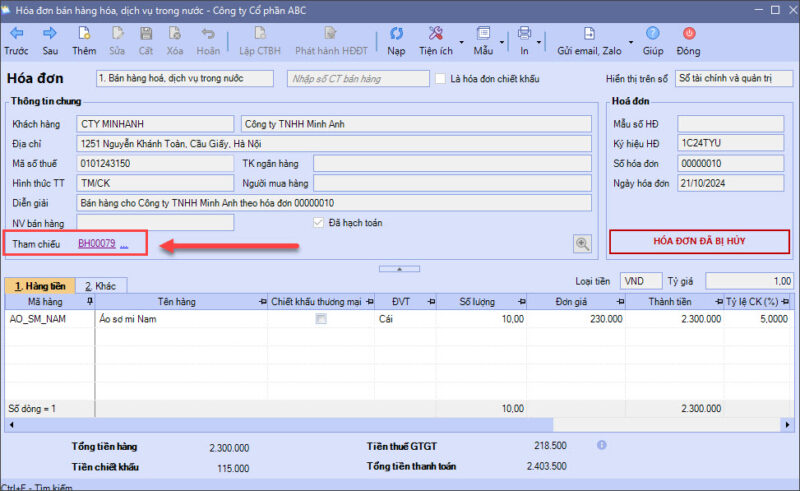 Nguyên nhân 1: Do chưa xoá Chứng từ bán hàng của Hoá đơn đã bị huỷ này, hoặc Hoá đơn đã bị huỷ đang được chọn trên 1 Chứng từ bán hàng khácGiải pháp: Cách 1: Xóa Chứng từ bán hàng của hóa đơn đã hủy, lập Chứng từ bán hàng mới phát hành hóa đơn thay thế Bước 1: Tìm lại Chứng từ bán hàng (CTBH) của Hóa đơn đã hủy.