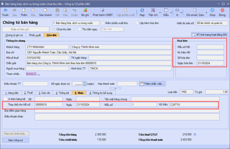 Bước 2: Trên Chứng từ bán hàng đó, nhấn Bỏ ghi\Xóa Bước 3: Thêm mới Chứng từ bán hàng hoặc Hóa đơn, tích chọn ô Là hóa đơn thay thế, bạn sẽ chọn được Hóa đơn đã bị hủy. Bước 4: Thực hiện điền thông tin trên chứng từ và sau đó phát hành HĐ thay thế. Trước khi phát hành, bạn kiểm tra lại thông tin trên hóa đơn xem đầy đủ chính xác. *Lưu ý: Hóa đơn thay thế phải có dòng Thay thế cho hóa đơn Mẫu số …, ký hiệu …, số …, ngày … tháng … năm …