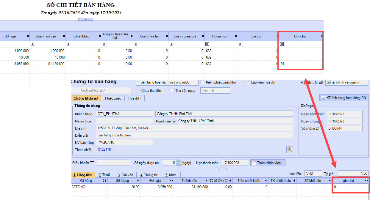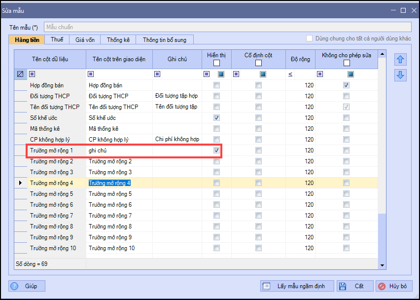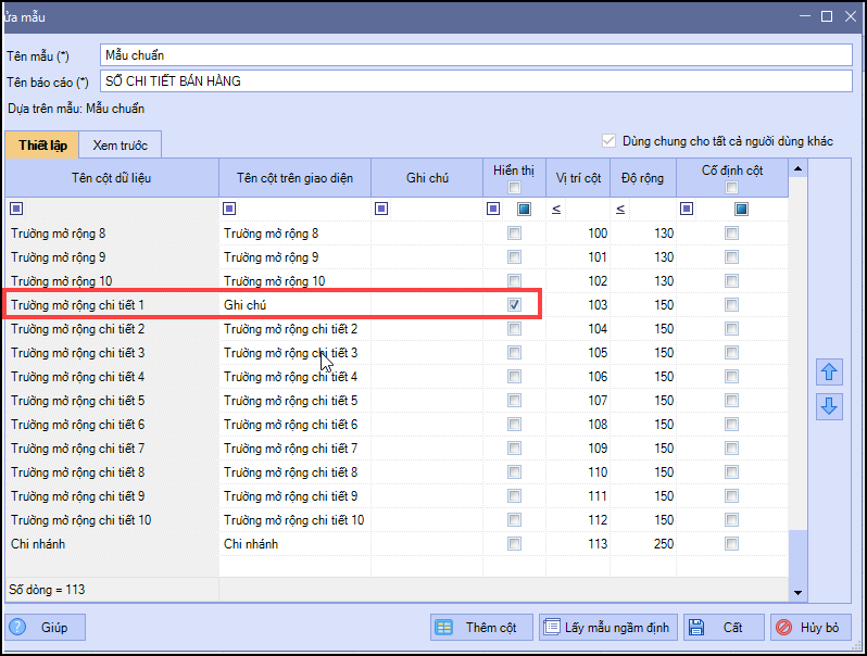 - Muốn hiển thị trên báo cáo chi tiết: sử dụng Trường mở rộng chi tiết