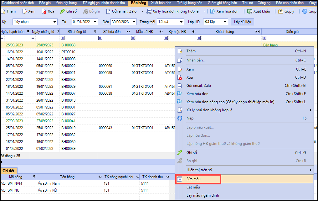 Bước 2: Trên danh sách chứng từ click chuột phải\Sửa mẫu để thực hiện lấy trường mở rộng lên danh sách chứng từ