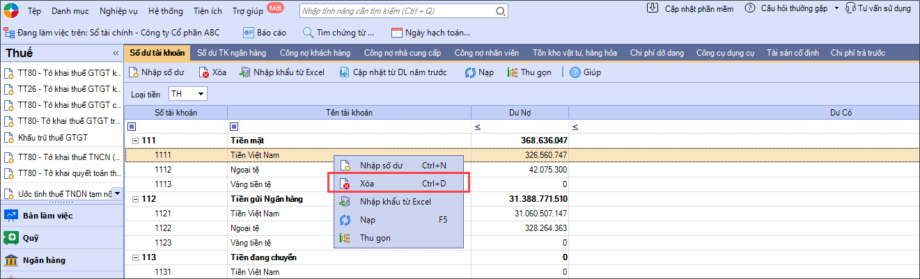Bước 2. Chọn tài khoản xóa số dư trên danh sách, sau đó chọn chức năng Xóa trên thanh công cụ hoặc nhấp chuột phải tài khoản đó và chọn Xoá.