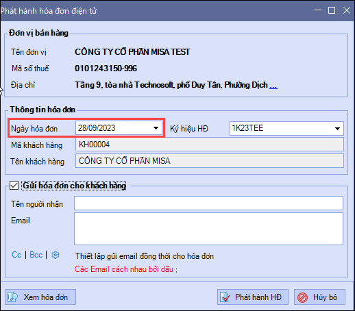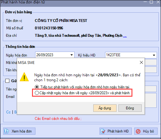 Lúc này đơn vị muốn sửa về ngày hiện tại thì tích chọn Cập nhật ngày hóa đơn về ngày xxx và phát hành
