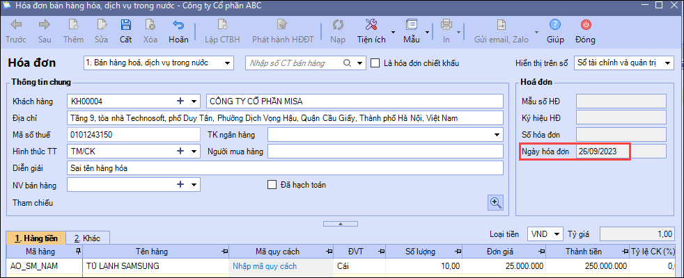 Biểu hiện: Khi vào sửa lại hóa đơn nhưng thông tin Ngày hóa đơn bị mờ không cho sửa lại