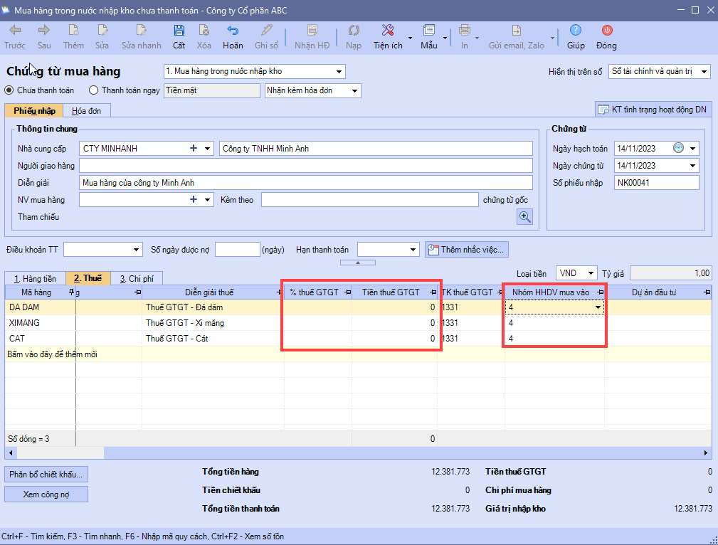 - Lưu ý về thuế suất và nhóm vật tư hàng hóa khi nhập liệu