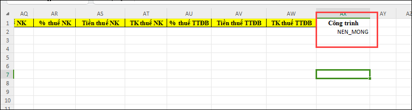Ví dụ: Nhập khẩu chứng từ mua hàng không qua kho, muốn thống kê nhập cột công trình nhưng trên file mẫu tải về không có trường để nhập.