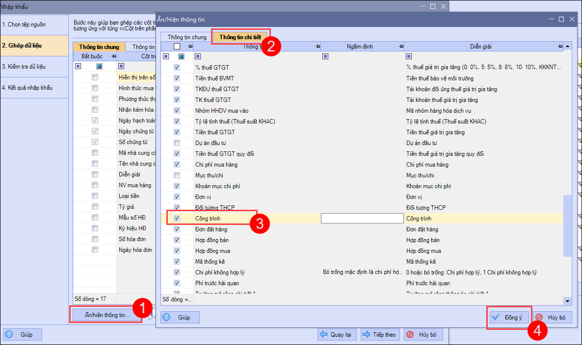Bước 2: Tại bước Ghép dữ liệu nếu cột vừa thêm không hiển thị trên giao diện, chọn Ẩn hiện thông tin\Thông tin chi tiết hoặc Thông tin chung\kéo chuột tìm đến cột cần hiển thị tích hiển thị\ nhấn Đồng ý.