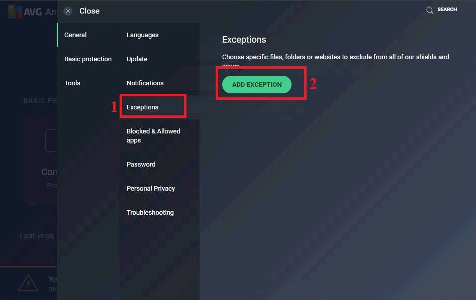 Bước 3:  Chọn Exceptions\Add Exceptions