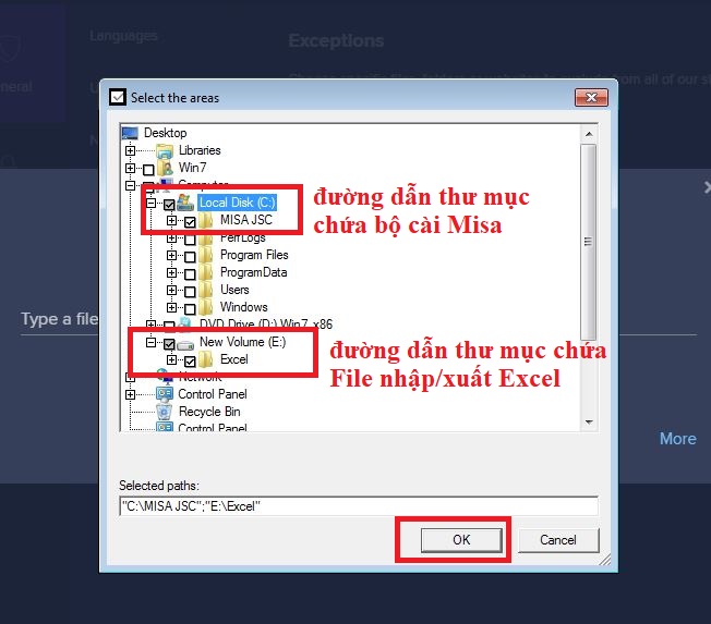 Bước 5: Tích chọn đường dẫn thư mục bộ cài MISA và đường dẫn chứa file nhập/xuất Excel (ví dụ: đường dẫn thư mục bộ cài Misa là “C:\MISA JSC” , còn đường dẫn chứa file excel là “E:\Excel”)\OK