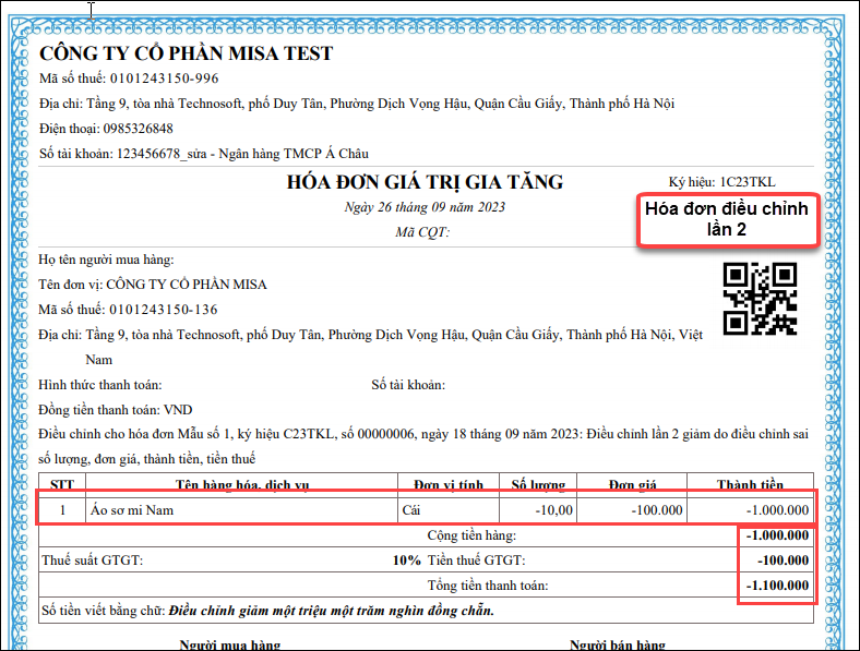 Ví dụ: Xuất hóa đơn gốc (số 1) là 1.100.000 đồng, bị sai tên hàng hóa và đã xuất hóa đơn điều chỉnh (số 2) nhưng điều chỉnh nhầm tăng thêm 1.100.000 đồng thì sẽ xuất hoá đơn điều chỉnh (số 3) điều chỉnh giảm số tiền đi 1.100.000 đồng.