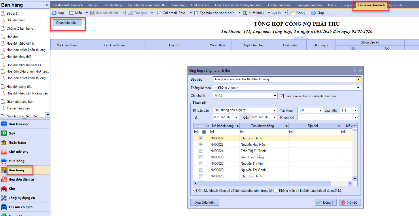 Bước 6: Tích chọn các Khách hàng và chỉ tiêu thống kê theo muốn kiểm tra thông tin.