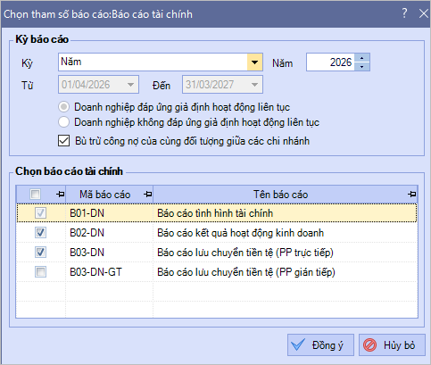 • Chương trình mặc định tích chọn B01-DN Bảng cân đối kế toán và không cho phép bỏ tích.