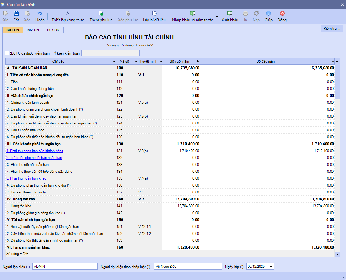 Lưu ý: Trường hợp Báo cáo tình hình tài chính không cân, có thể kiểm tra bằng chức năng Kiểm tra trên tab B01-DN. Xem hướng dẫn tại đây.