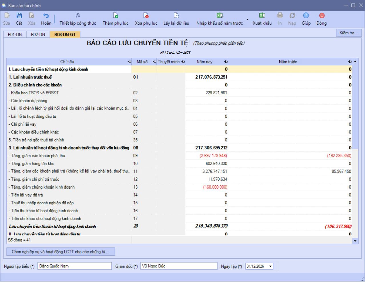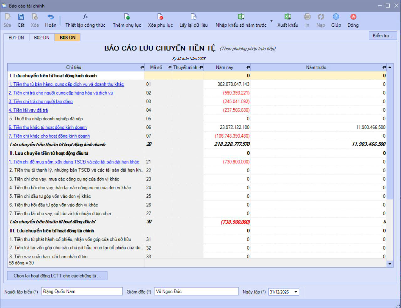 • Tab B03-DNN/B03-DNN-GT: Báo cáo lưu chuyển tiền tệ (PP trực tiếp/gián tiếp).