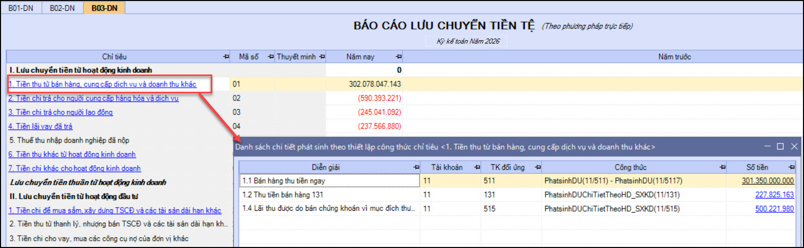 • Với Báo cáo lưu chuyển tiền tệ PP trực tiếp, có thể kiểm tra cách lấy số liệu từng chỉ tiêu bằng cách nhấn vào chỉ tiêu muốn kiểm tra. Xem hướng dẫn tại đây.