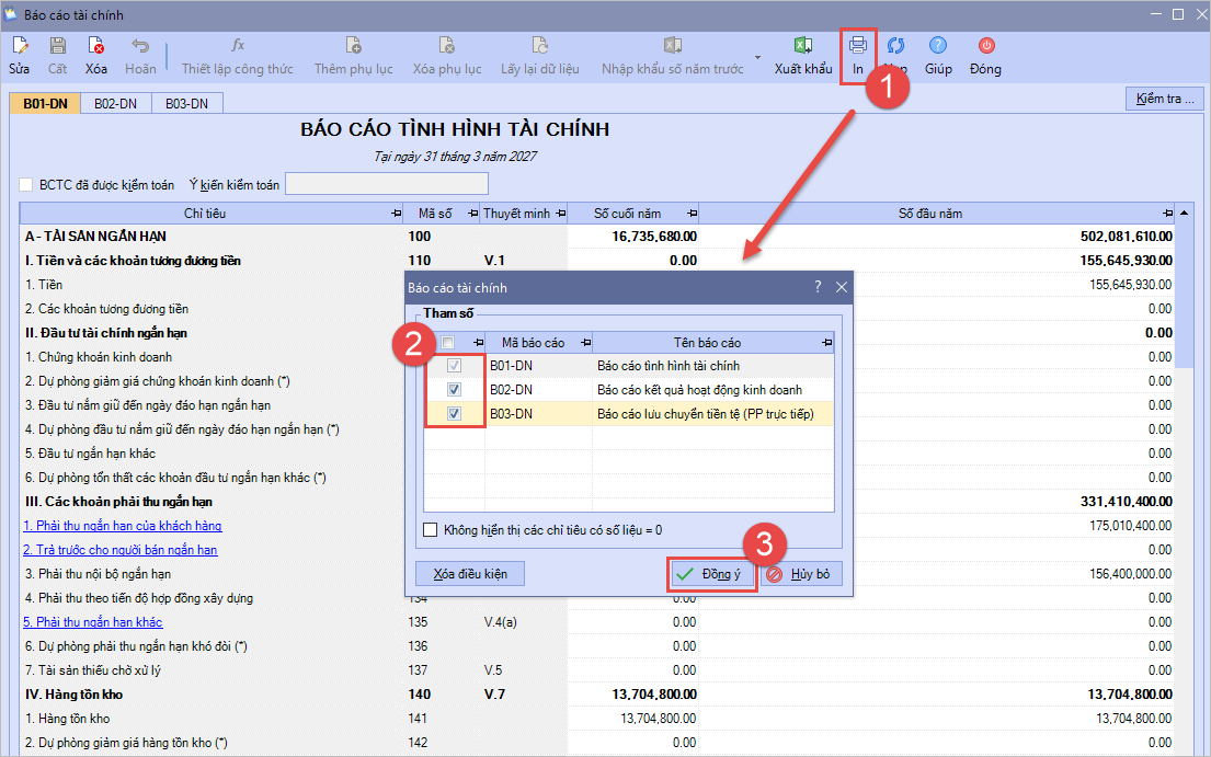 Bước 7: Chọn chức năng In trên thanh công cụ để in báo cáo tài chính.