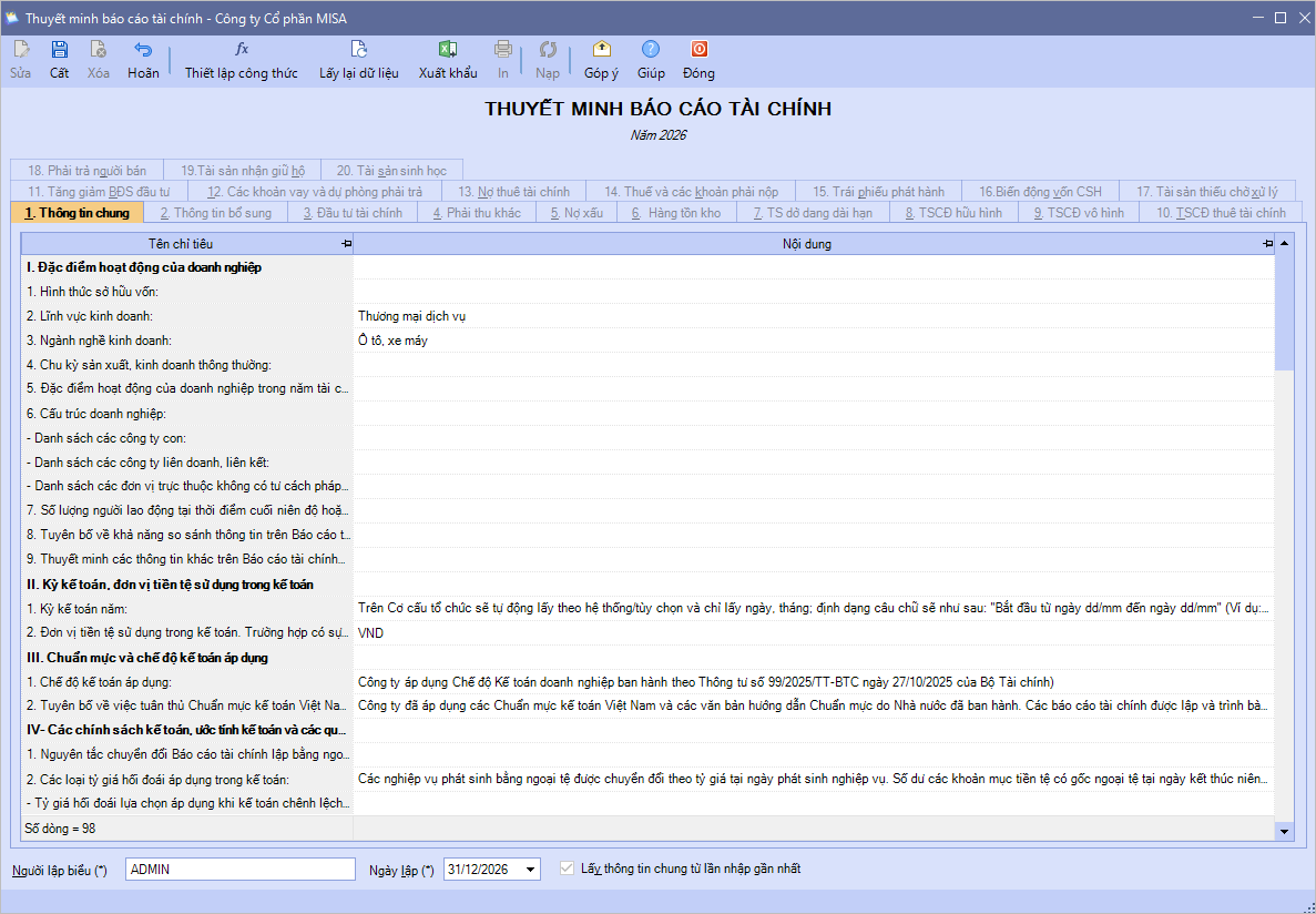• Vào phân hệ Tổng hợp, tab Lập BCTC, chọn chức năng Thêm\Thuyết minh báo cáo tài chính.