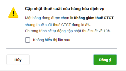 - Với VTHH đang có thuế suất 8%, khi người dùng cập nhật trạng thái không giảm thuế, chương trình đồng thời đưa ra thông báo tự động cập nhật thuế suất về 10% để người dùng xác nhận.