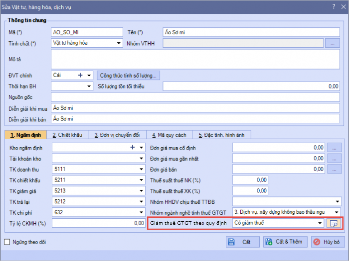 - Nhấn “Có giảm thuế”: Hệ thống cập nhật trạng thái “Có giảm thuế” và thuế suất 8% trên Danh sách cột Giảm thuế GTGT theo quy định và trong giao diện chi tiết của VTHH.