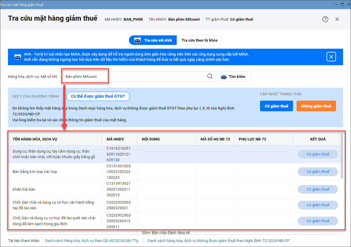 - Chương trình chỉ hỗ trợ tra cứu mã HS của danh sách hàng hóa dịch vụ không được giảm thuế trên Nghị định 72. Đồng thời người dùng có thể tìm theo tên và mã gần đúng của hàng hóa dịch vụ, ví dụ: áo sơ mi, kìm cộng lực, bút bi, sản phẩm tự giấy, thép cuộn, A111…