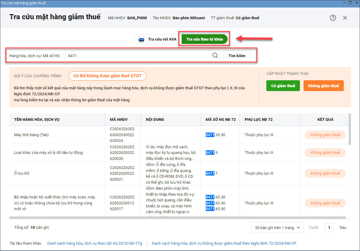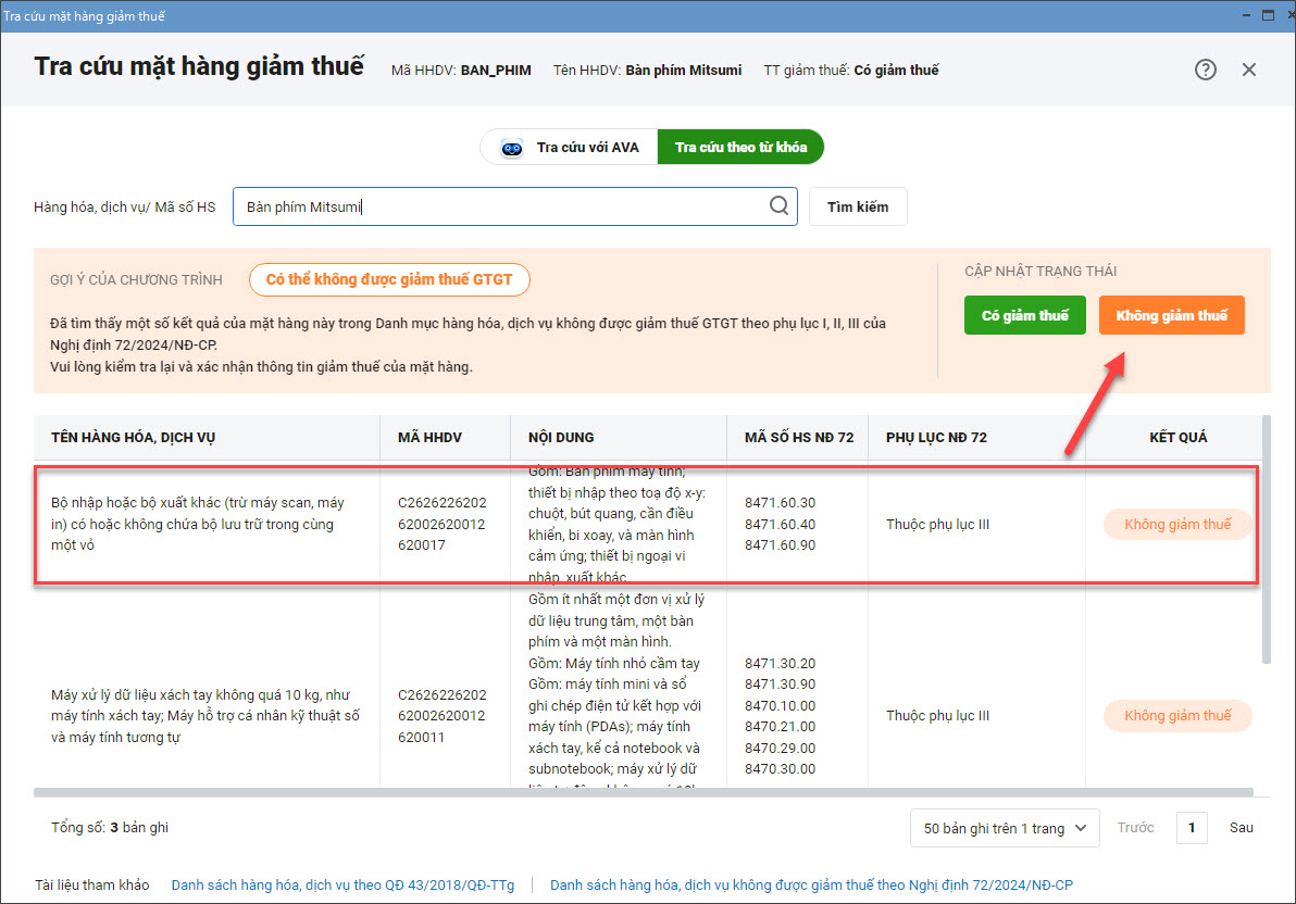 Bước 4: Phần mềm đưa ra gợi ý “Có giảm thuế” và “Không giảm thuế” dựa theo danh sách kết quả tìm kiếm. Người dùng kiểm tra lại thông tin tra cứu và nhấn chọn “Có giảm thuế” hoặc “Không giảm thuế” để xác nhận và cập nhật vào mã hàng đang tra cứu.