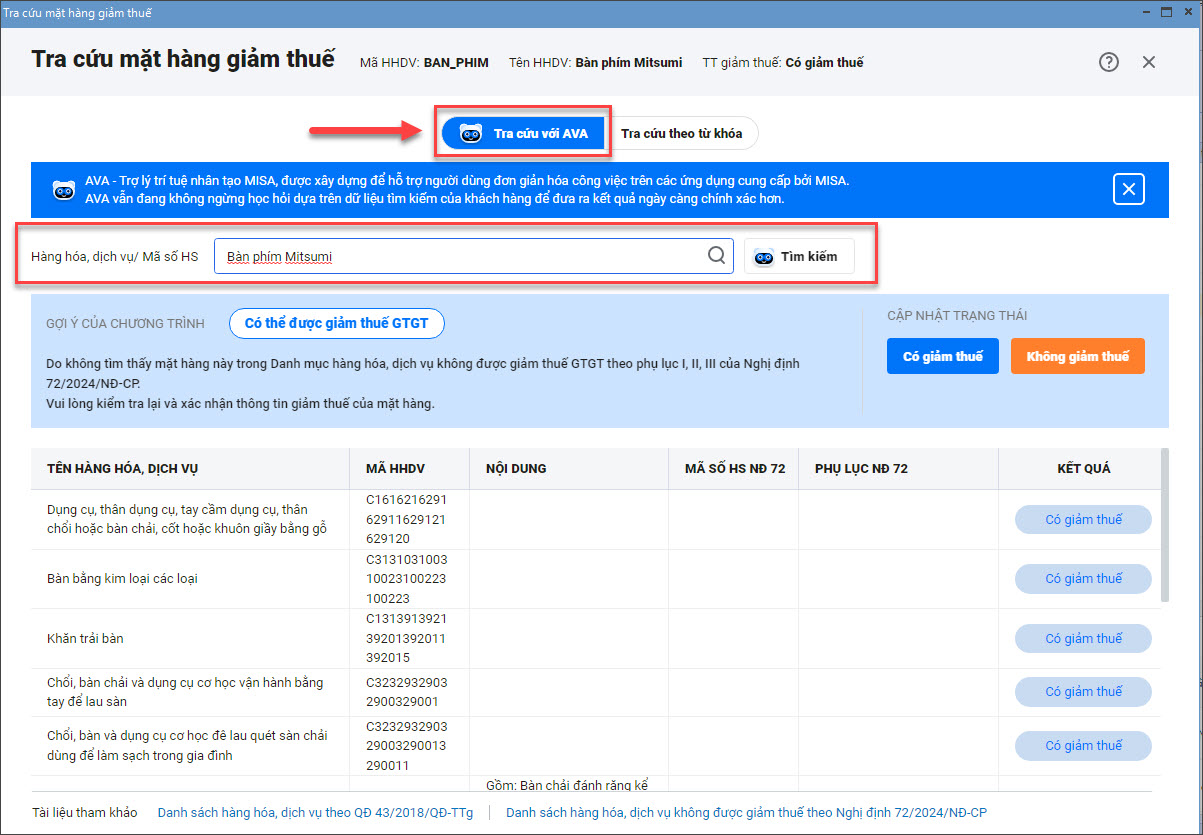- Hỗ trợ tra cứu theo tên, mã hàng, mã HS và sử dụng trợ lý AI AVA
