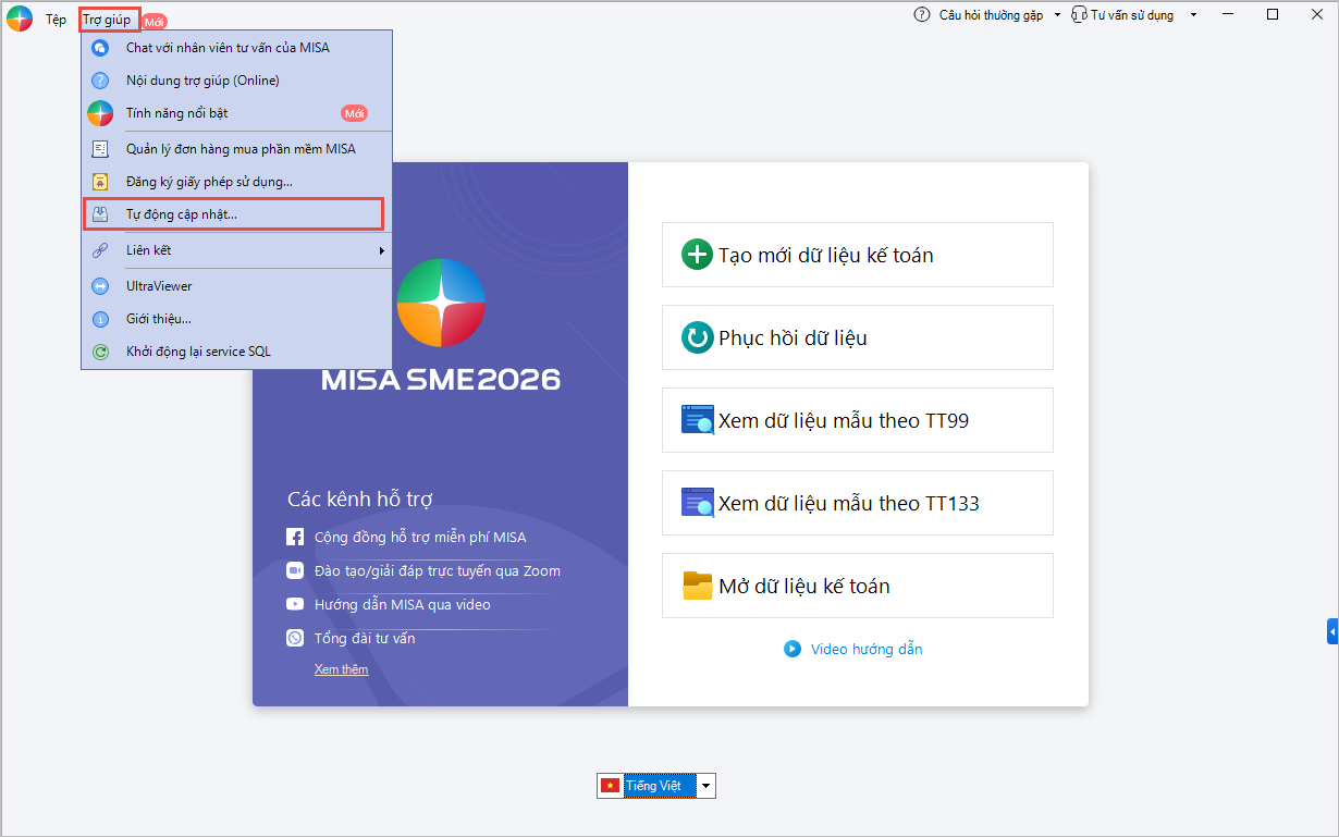 Bước 1: Mở phần mềm, vào menu Trợ giúp\Tự động cập nhật.