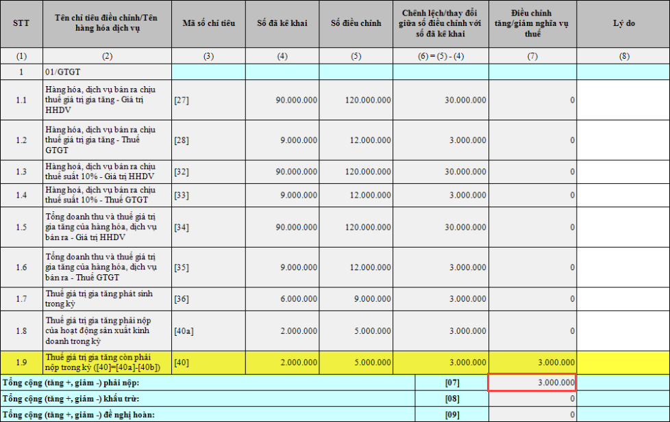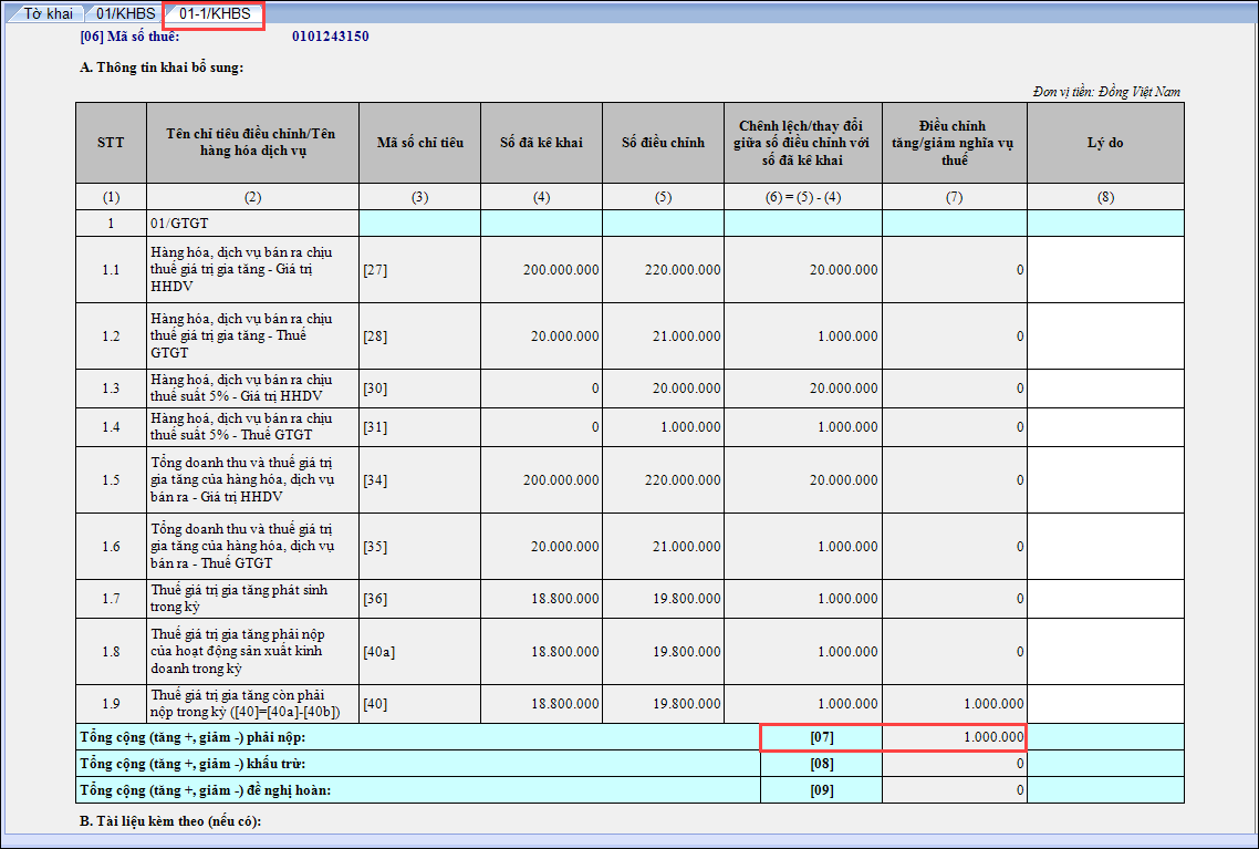Khi lập tờ khai bổ sung thuế GTGT, Bản giải trình bổ sung (01-1/KHBS) chỉ tiêu Tổng cộng (tăng +, giảm -) phải nộp [07] > 0 (tăng số thuế phải nộp)