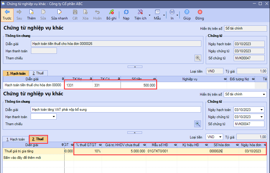 Bước 5: Vào Hạch toán tăng giá trị và tiền thuế hóa đơn thay thế. Nợ 1331, 156…\Có 331: giá trị hàng hóa/dịch vụ và số thuế GTGT của hóa đơn thay thế (kê khai thông tin số hóa đơn, ngày hóa đơn, % thuế, tiền thuế bên tab 2.Thuế để lên tờ khai hiện tại) tại thời điểm điều chỉnh.