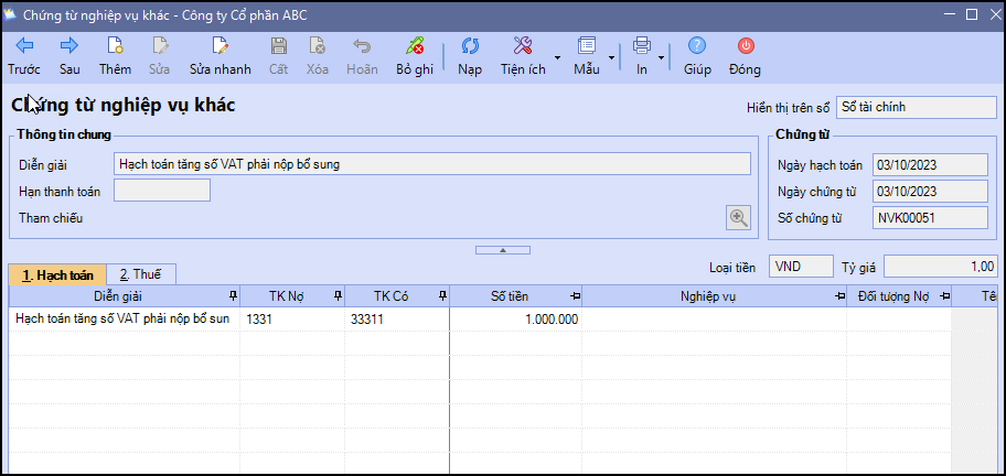 Bước 4: Vào Tổng hợp\Chứng từ Nghiệp vụ khác hạch toán Nợ 1331/Có 33311: Số thuế cần phải nộp bổ sung tại thời điểm điều chỉnh