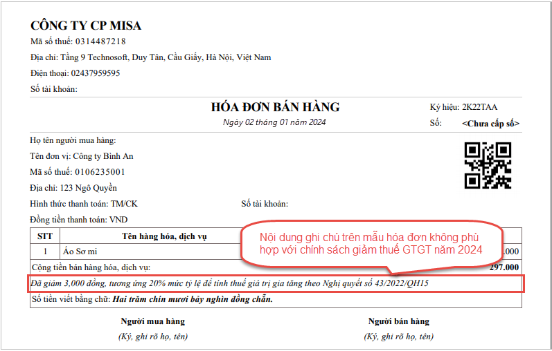 Do mẫu hóa đơn khi in ra chứa nội dung ghi chú đã giảm thuế theo NQ43, hoặc NQ101 – Không phù hợp với quy định theo Nghị quyết 110/2026/QH15, MISA khuyến nghị người dùng nâng cấp lên MISA SME 2023 – R19 trở đi để thuận tiện thao tác và phát hành hóa đơn theo đúng mẫu quy định năm 2024.