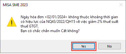 • Nhấn Yes để bỏ qua cảnh báo và tiếp tục Cất chứng từ, hóa đơn.