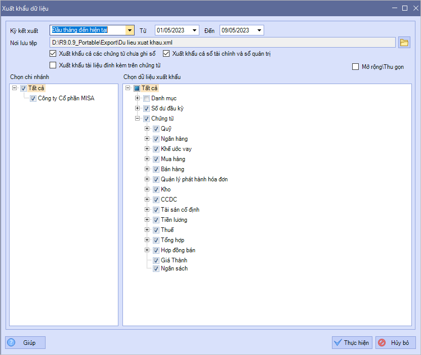 - Hướng dẫn thao tác xuất khẩu dữ liệu, lựa chọn danh mục, chứng từ và thời gian xuất khẩu