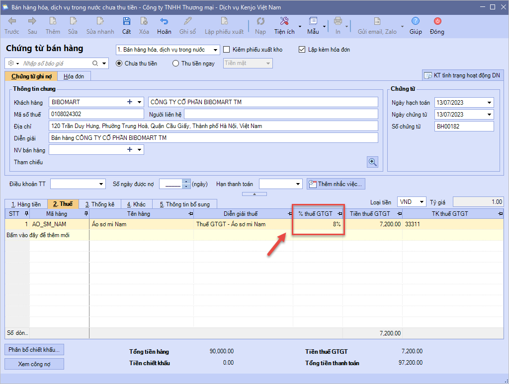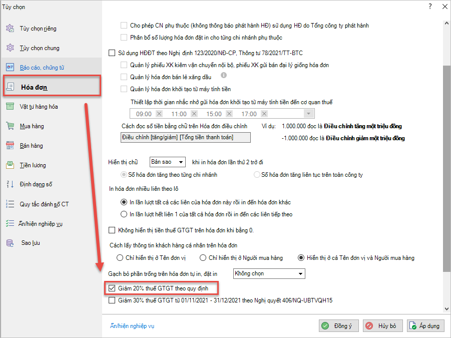 Với doanh nghiệp xuất hóa đơn bán hàng theo phương pháp trực tiếpPhần mềm bổ sung trên Hệ thống\Tùy chọn\Hóa đơn: Tùy chọn Giảm 20% thuế GTGT theo quy định