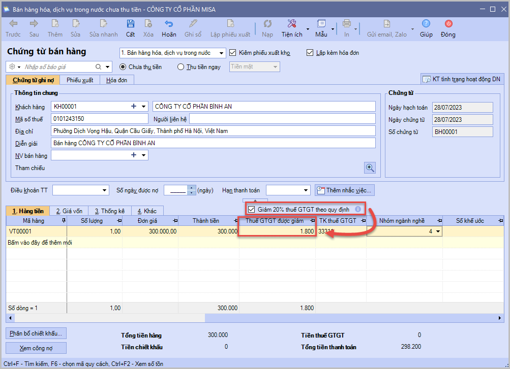 Bước 1: Khi người dùng tích chọn Giảm 20% thuế GTGT theo quy định thì giao diện chi tiết chứng từ sẽ bổ sung các cột sau: